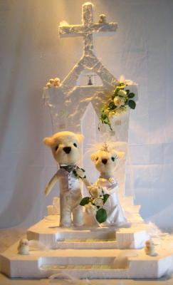 このコたちの服も、式当日にご本人らがお召しになる予定の衣装に、極力近いものを作って着せてあります。種類や大きさについてはご相談に応じて自由にお作りしてます。ただ、すべてオーダーメイドのため完成までに時間がかかってしまうので、なるべく2か月前にはご注文していただくようにお願いいしています。(服を着せる場合は、ご注文後にドレス姿などのお写真をお借りしてます)