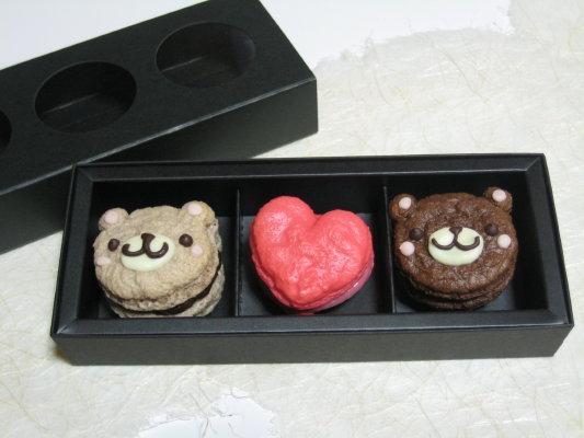 オレンジキュラソー(リキュール)入りのガナッシュクリームを、くま形のココア生地でサンド