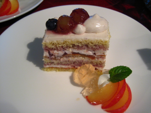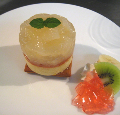 その上に梨のコンポートをゼリーで固めたものを乗せました。