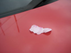 車のフロントに桜の花びらがはらり。
